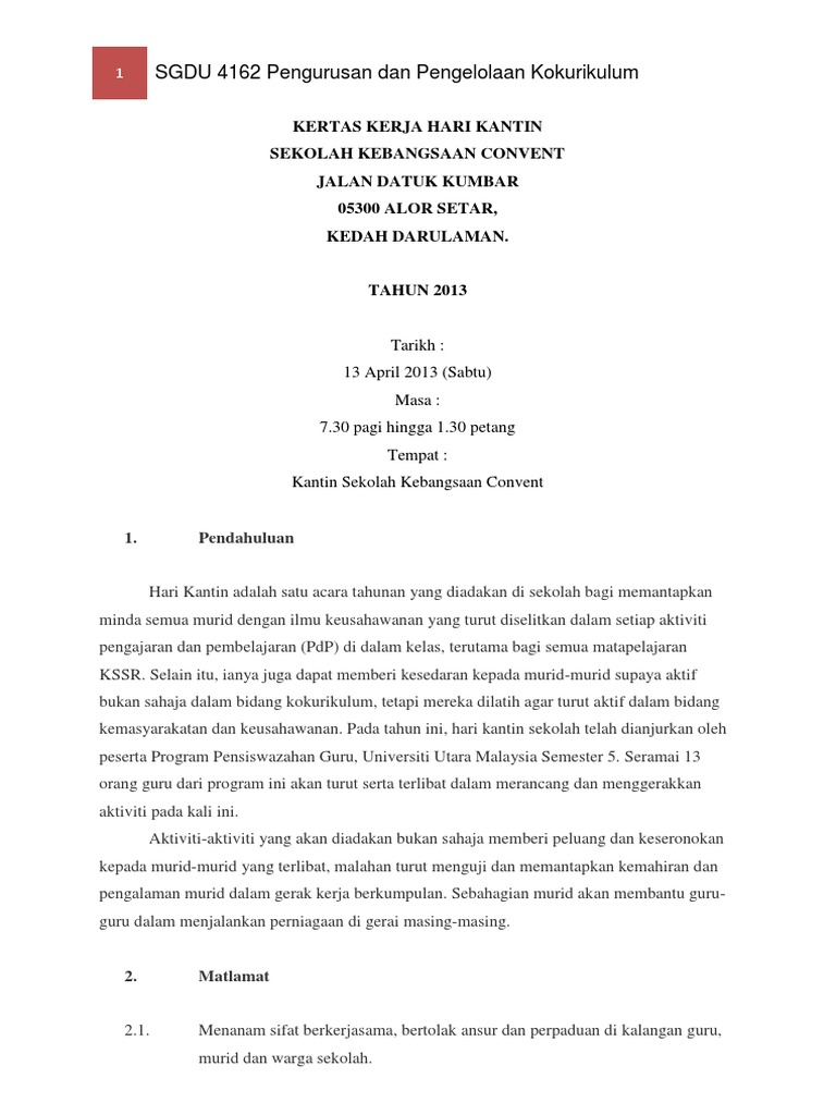 . Hari Kantin itu dirasmikan oleh pengerusi Persatuan Ibu Bapa dan Guru. KERTAS KERJA HARI KANTIN SEKOLAH MENENGAH KEBANGSAAN JALAN KEBUN SEKSYEN 32 SHAH ALAM SELANGOR DARUL EHSAN 10 PENDAHULUAN Pada tahun. JAWATANKUASA KANTIN SAMTAJ SG.